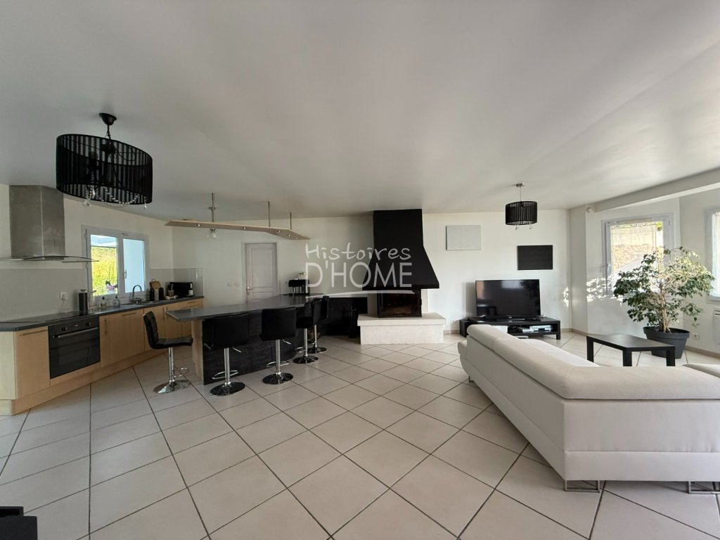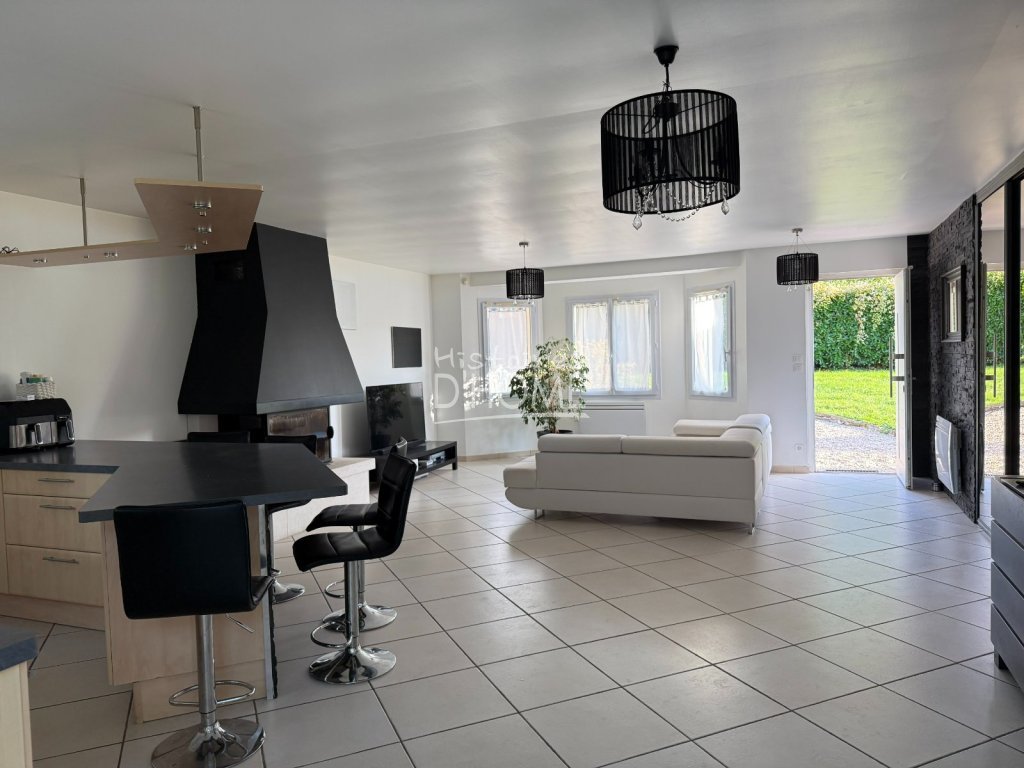 Élevée sur vide sanitaire, elle se compose d'une entrée avec rangements, ouvrant sur un spacieux séjour-salon lumineux agrémenté d'une cheminée avec insert, et d'une cuisine ouverte aménagée et équipée.